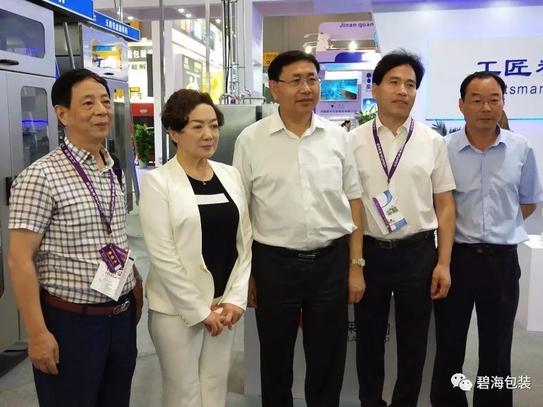 碧海公司董事长厉善红、副总经理王立、副总经理刘红珍向参观领导介绍了此次展示的BH7500-200SQ钻石包型无菌纸盒灌装机,毕司长高兴地说:“我们在国产奶业包装设备前拍照留念,为国产设备站台!”