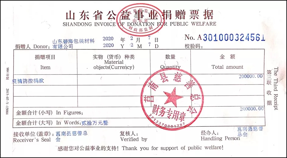 近来,新型冠状病毒引起的肺炎疫情形势严峻,时刻牵动着全国人民的心。共抗疫情,责任在肩,山东碧海包装材料有限公司为了积极助力疫情防控,于2020年2月7日捐款人民币20万元,驰援抗击疫情,所捐款项将用于抗击新型冠状病毒肺炎疫情。