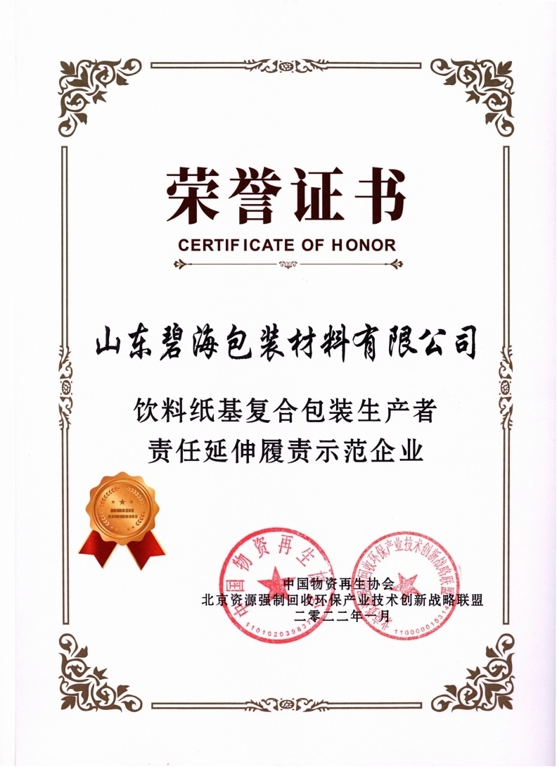 2022年1月12日,中国饮料纸基复合包装可持续发展协作体2021年度会议在北京召开。会议对碧海公司在2021年推行环境友好包装设计、开发可再生原料包装、共建饮料纸基复合包装回收协作体、规范回收利用等方面的工作给予了肯定,授予“饮料纸基复合包装生产者责任延伸履责示范企业”荣誉称号。