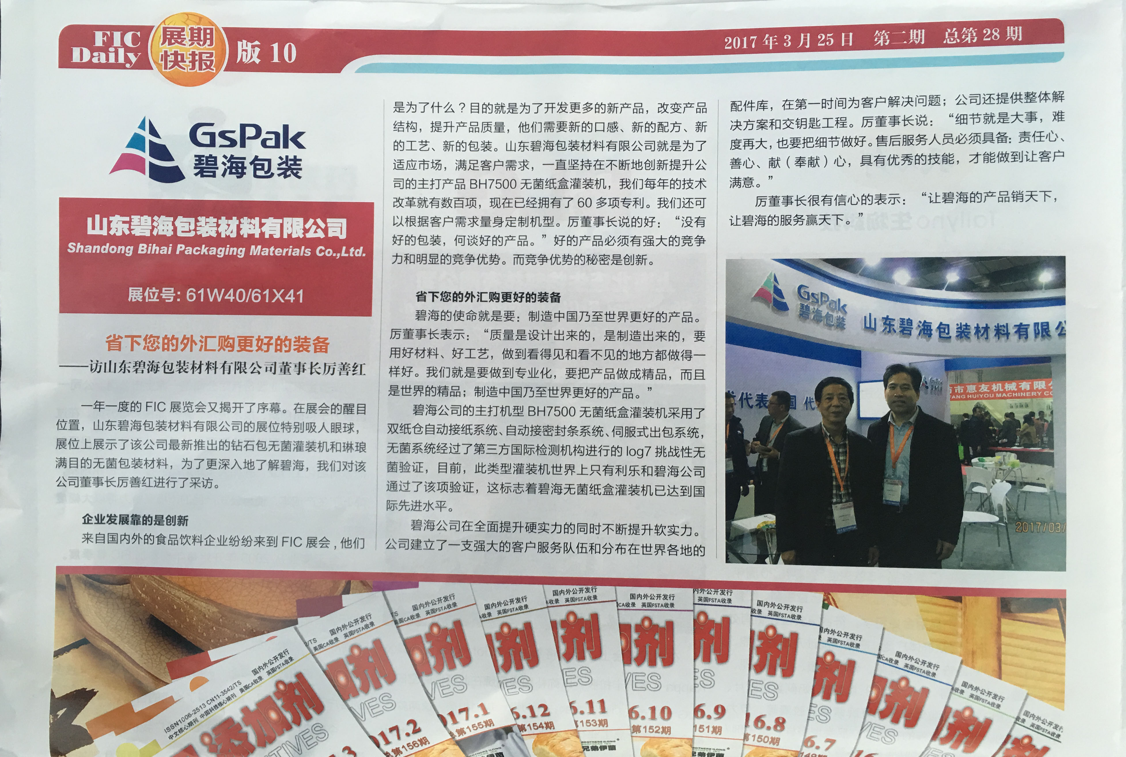 来自国内外的食品饮料企业纷纷来到FIC展会,他们是为了什么?目的就是为了开发更多的新产品,改变产品结构,提升产品质量,他们需要新的口感、新的配方、新的工艺、新的包装。山东碧海包装材料有限公司就是为了适应市场,满足客户需求,一直坚持在不断地创新提升公司的主打产品BH7500无菌纸盒灌装机,我们每年的技术改革就有数百项,现在已经拥有了60多项专利。我们还可以根据客户需求量身定制机型。厉董事长说的好:“没有好的包装,何谈好的产品。”好的产品必须有强大的竞争力和明显的竞争优势。而竞争优势的秘密是创新。